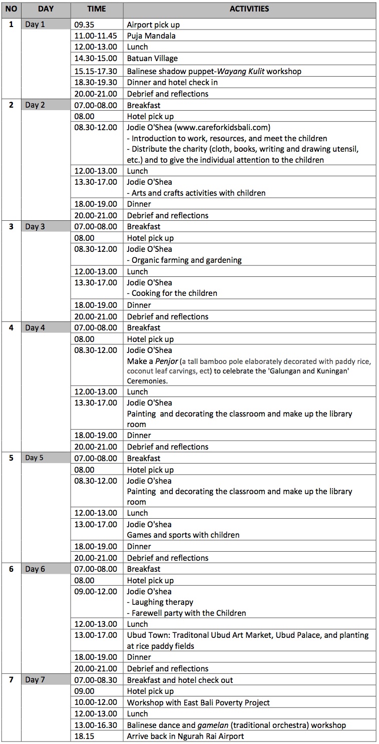 - All Voluntary program in Jodie O’Shea (www.careforkidsbali.com): 1) Introduction, 2) Arts and crafts, 3) Organic farming, 4) Cooking, 5) Penjor, 6) Painting and decorating the classroom and make up the library room, 7) Games and sport, and 8) Farewell party.